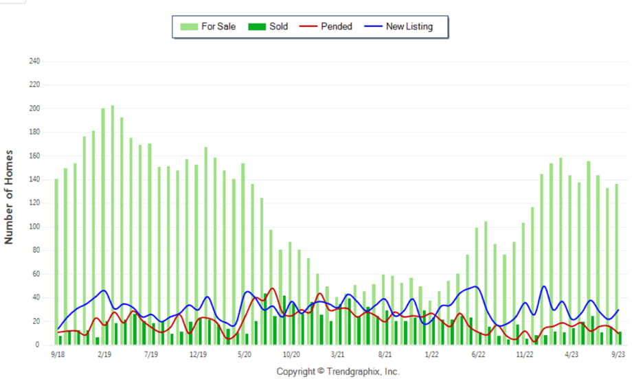 Over the past five years, we see a lot of homes available to sell in the light green bars, a consistent amount of properties coming on the market (blue line), a surge in activity in contracts written beginning in June 2020 and continuing to April 2021—and then a settling of contracts to approximately the same amount of sales we saw this time 5 years ago (red line). In the chart above, we also see that approximately 20 contracts had been written on a monthly basis until this year; our pending contracts numbers have declined and we now see less than 20 contracts a month.